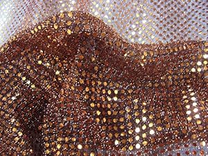 Product Description : Our Faux Sequin Knit featured small reflective dots that are adhered to a lightweight, sheer knit. 4" stretches to 6" across the grain. Since the knit is so airy, you can change the look of the fabric with the lining you choose -- white will brighten it and black will darken it, etc. This fabric is a black knit with copper dots and copper lurex. Faux Sequin Knit Fabric - 342 Copper. Polyester with Lurex. 44" wide. Hand wash cool, line dry, no iron. Priced per yard.