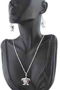 Ladies Silver with Purple Iced Out Sea Turtle 20 Inch Adjustable Chain Necklace & Matching Earrings Jewelry Set